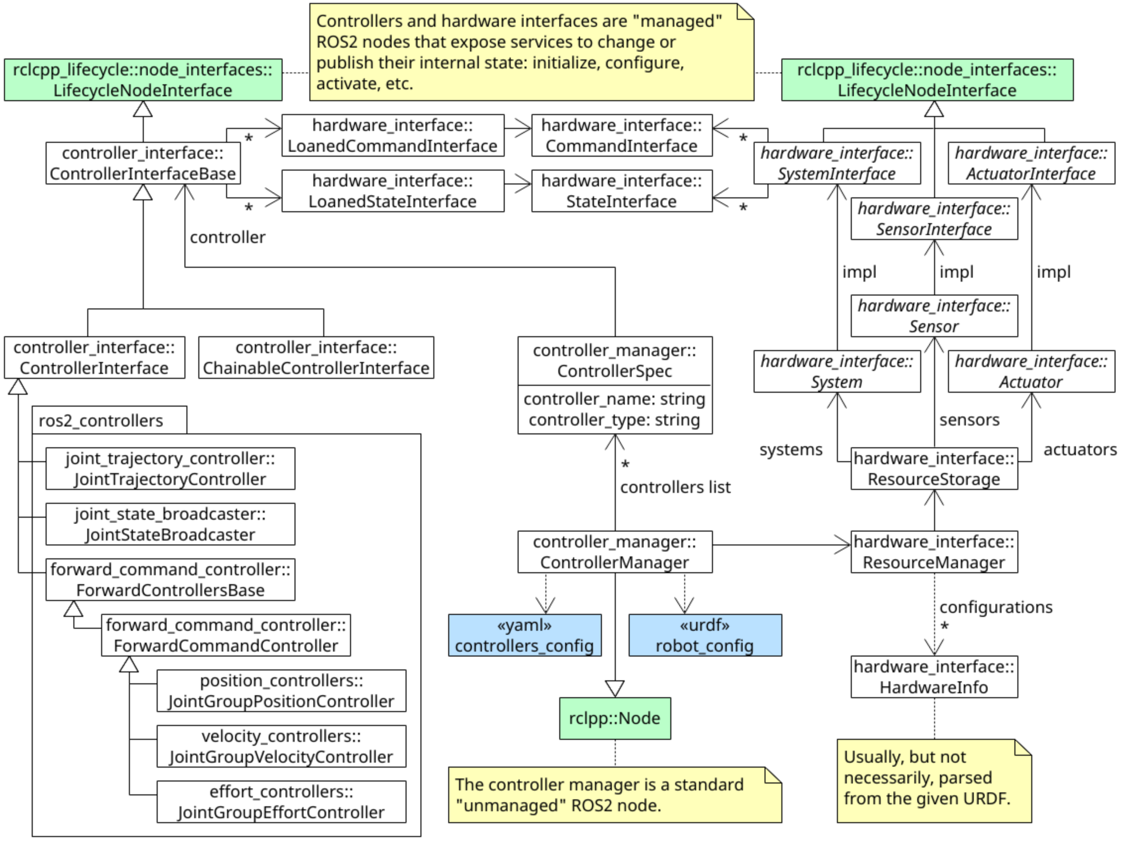 The following UML Class Diagram describes the internal implementation of the ros2_control framework.